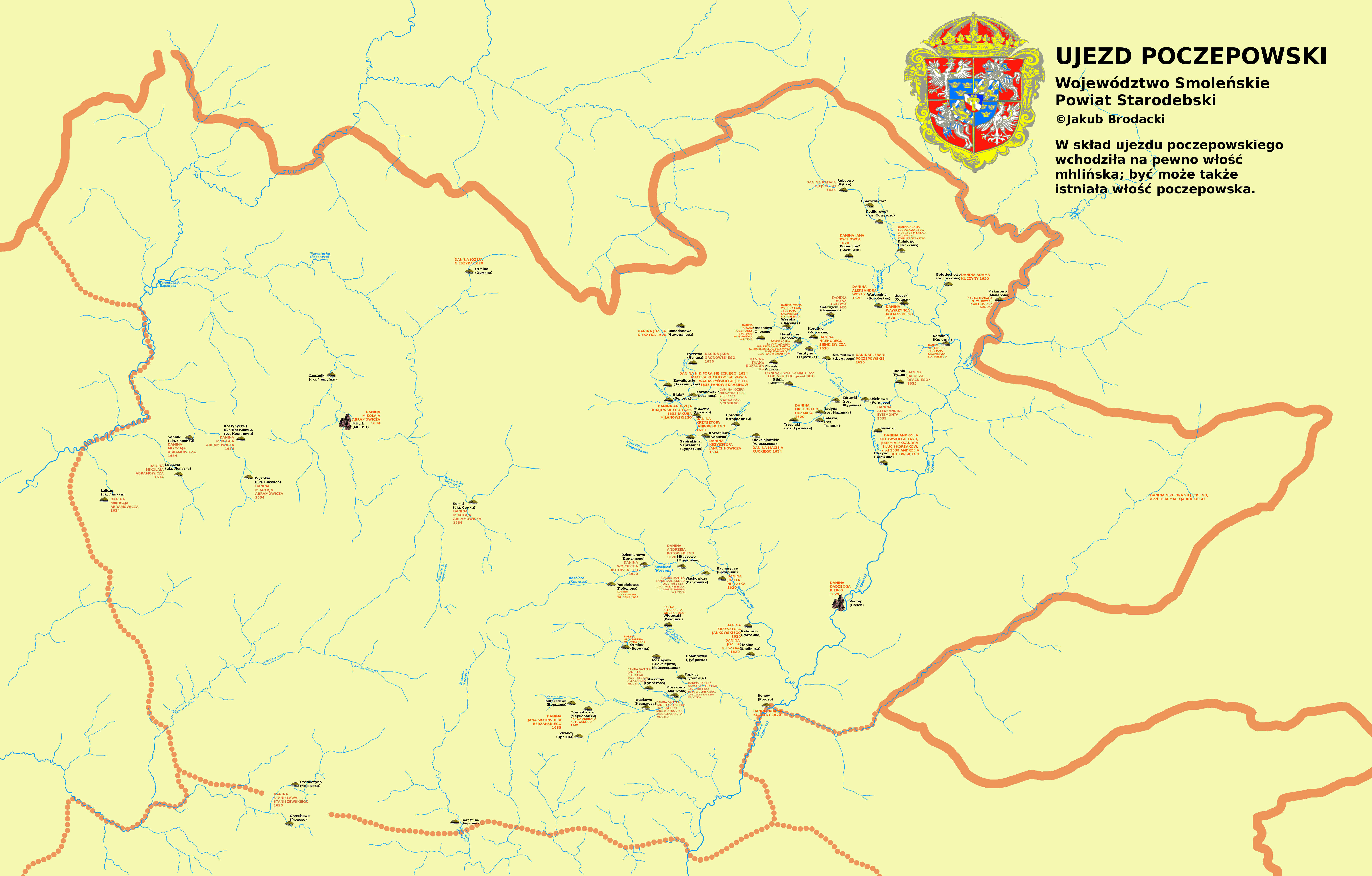Kozacy poczepowscy, dn. 8 04 1625, Nadanie kozakom poczepowskim na koni 50 włók 200, po 4 włóki na „koń” jeden, także place w zamku na pobudowanie domów i ogrody za zamkiem Poczep, z wolnizną na lat 6, z chorągwią w kolorze czerwonym z krzyżem białym. Mają być pod władzą „przełożonego” zamku Poczep (kapitana?). Mają obowiązek pełnienia służby kozackiej i straży na zamku kolejnej, gdzie im będzie ukazana. Sądzić się mają prawem i statutem, którym sądzą się kozacy przez starostę, w niebytności kapitana odprawowane być mają. Co kwartał mają odbywać popisy. Król nie będzie ich przymuszać do noszenia listów królewskich. W razie dłuższego oblężenia mają otrzymywać żołd po 8 zł na koń ze skarbu za każdą ćwierć. Brak informacji gdzie dokładnie były ich daniny, sądzić jednak trzeba, że w pobliżu miasta Poczep, tak jak to było z kozakami pod Smoleńskiem. ML 101, 242v